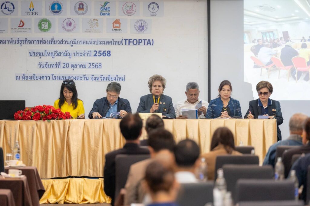 สำหรับการประชุมใหญ่วิสามัญของสมาคมสมาพันธ์ธุรกิจการท่องเที่ยวส่วนภูมิภาคแห่งประเทศไทย (TFOPTA) ประจำปี 2568 นี้สมาคมสมาพันธ์ธุรกิจการท่องเที่ยวส่วนภูมิภาคแห่งประเทศไทย (TFOPTA) ได้จัดขึ้นที่โรงแรมดวงตะวัน อ.เมืองเชียงใหม่ จ.เชียงใหม่ ตั้งแต่วันที่ 20 ตุลาคม 2568 ที่ผ่านมา เพื่อส่งเสริมความสัมพันธ์อันดี และเป็นแรงขับเคลื่อนธุรกิจด้านการท่องเที่ยวภายในภูมิภาคและเชื่อมโยงข้ามภาค ตลอดจนสนับสนุนพันธกิจการด้านการท่องเที่ยวของประเทศ โดยมีสมาชิกของ TFOPTA จากทั้ง 5 ภูมิภาค ประกอบด้วย ภาคเหนือ, ภาคกลาง, ภาคใต้, ภาคตะวันออก และภาคตะวันออกเฉียงเหนือ เข้าร่วมประชุม